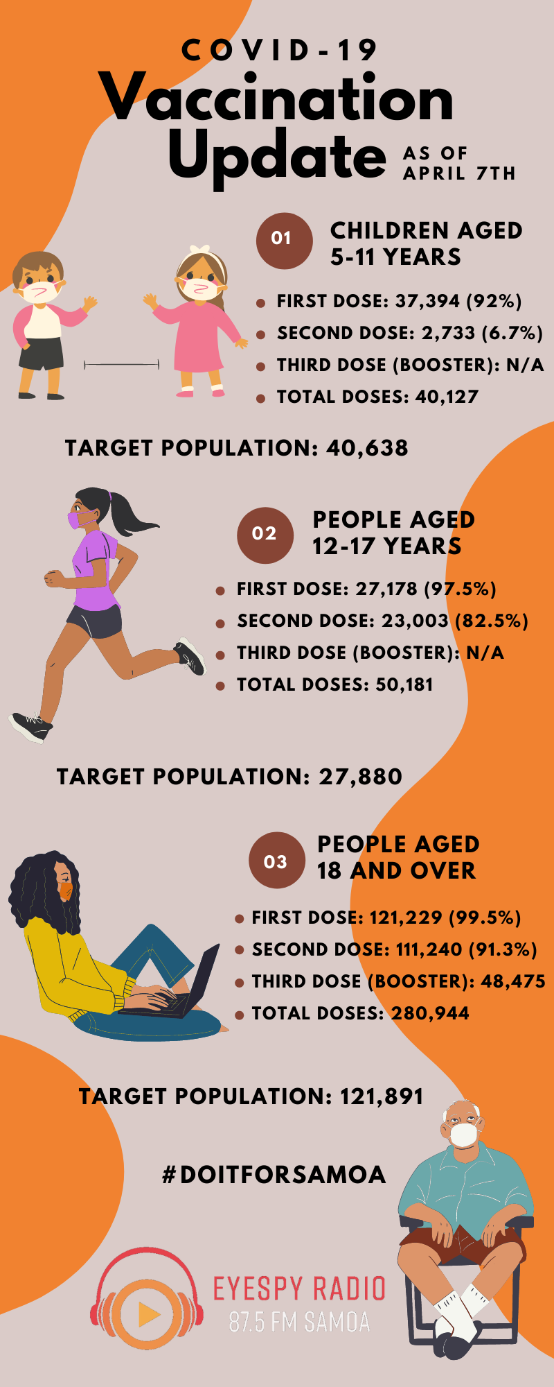 As at 2:00pm, April 7th 2022, the latest Vaccination update from the Ministry of Health has confirmed 97.6 percent of Samoa’s eligible population have received their first dose of COVID Vaccines. However, over a quarter of these are still yet to receive their second dose, with only 71.9 percent reported to have completed both doses. The Ministry also confirmed 48,475 people over the age of 18 have received their booster shots so far.